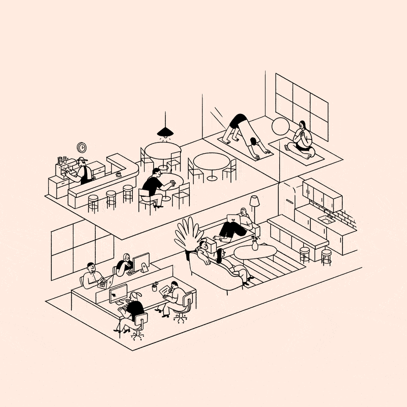 Accessible offices, meeting rooms, wellness studio, café and lounge spaces