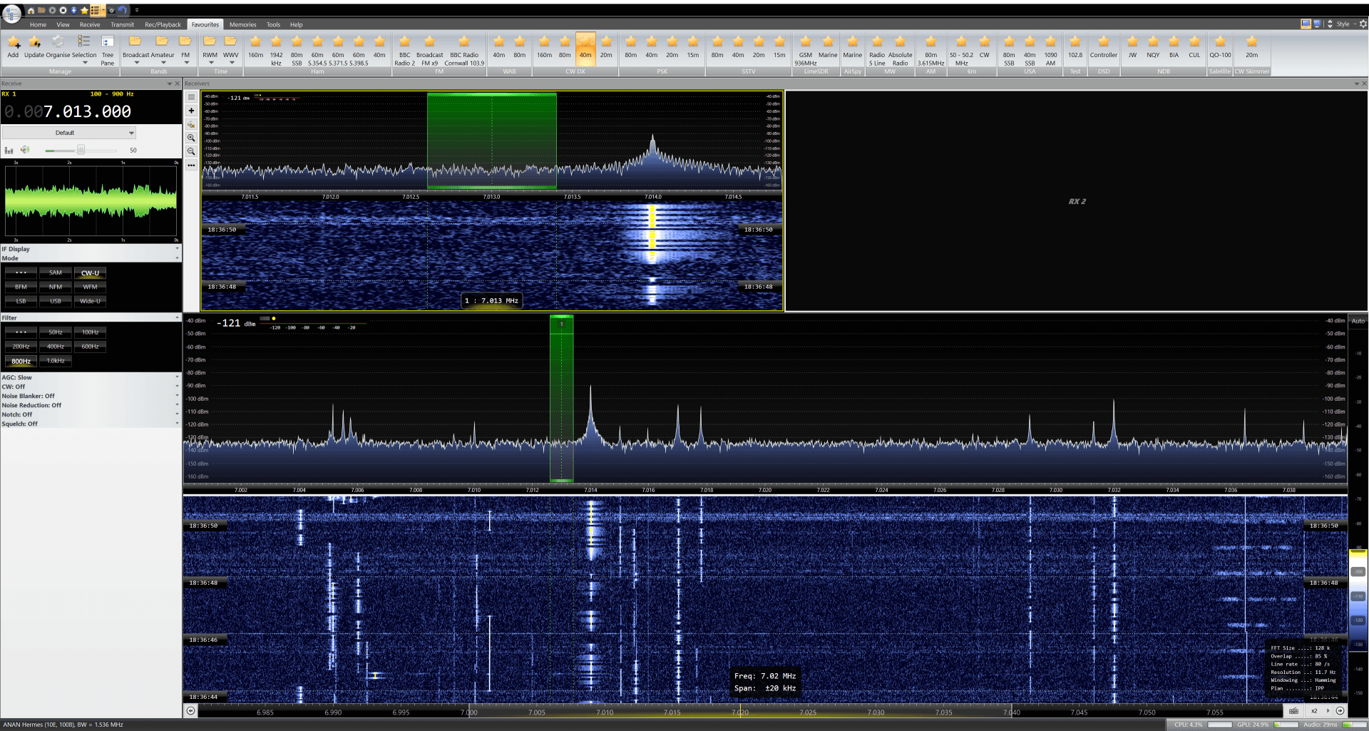 - The waterfall starts scrolling with CW signals.
