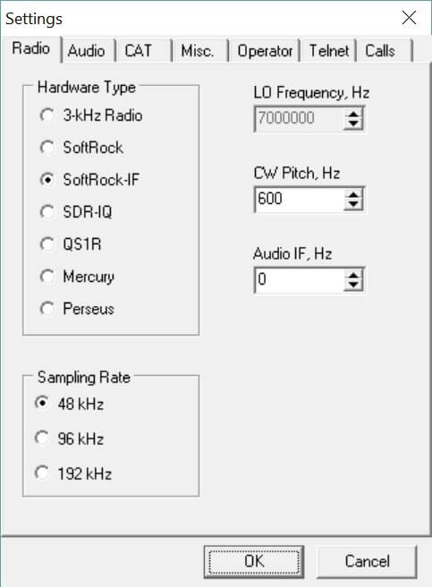 Select Hardware Type SoftRock-IF, sample rate 48kHz.
