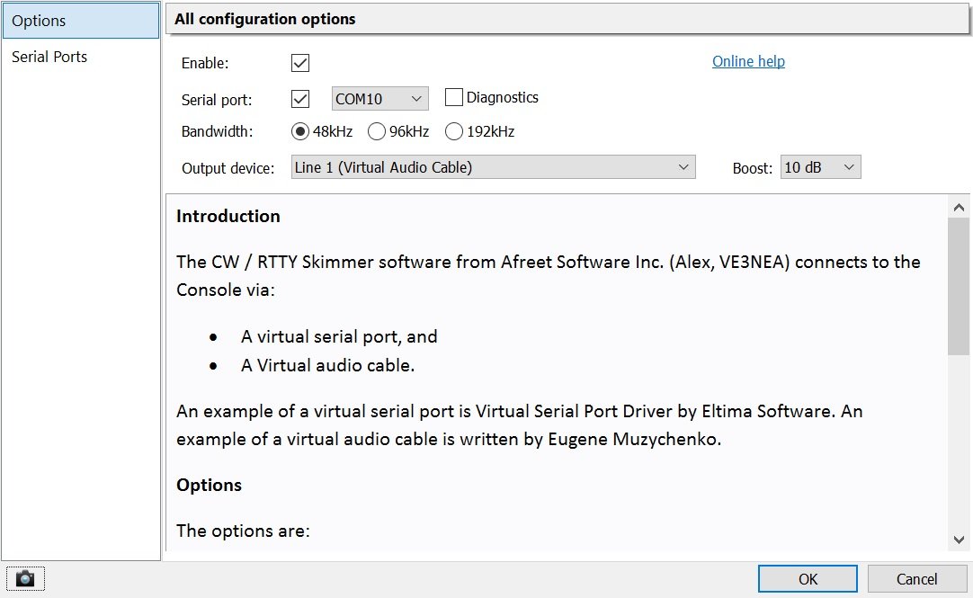 - Install a virtual serial cable - frequency control between SDR Console and CW Skimmer using the TS-2000 CAT protocol,