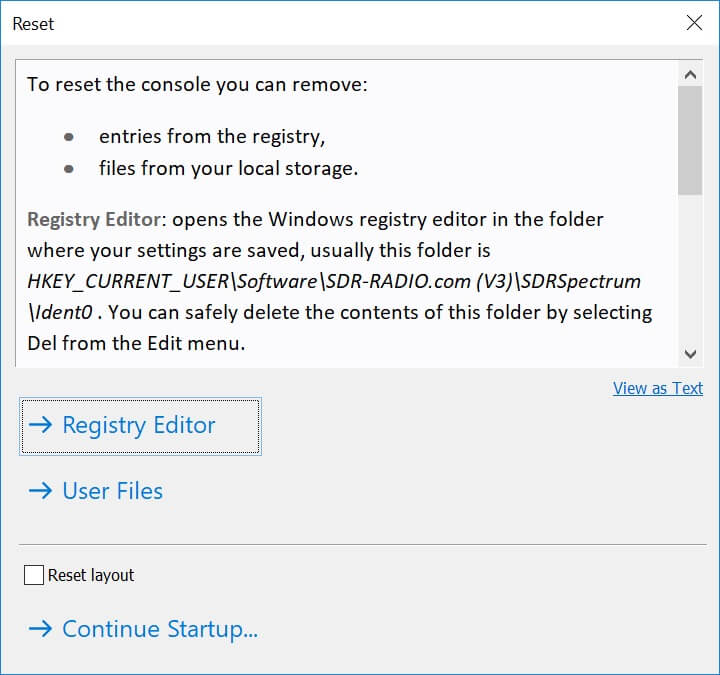 The folder HKEY_CURRENT_USER\Software\SDR-RADIO.com (V3)\SDRSpectrum\Ident0_001 contains layout information, this folder can also be deleted with the registry editor.