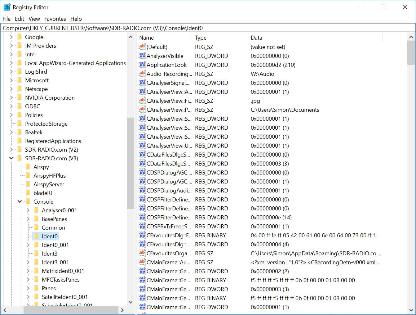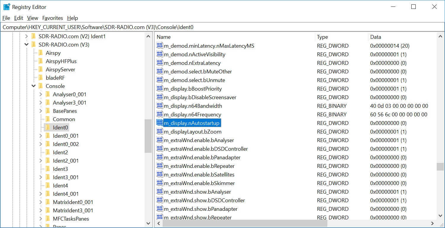 Use this option to remove the user settings selected with the Program Options. Selecting this option opens the Windows registry editor in the folder where your settings are saved, usually this folder is HKEY_CURRENT_USER\Software\SDR-RADIO.com (V3)\SDRSpectrum\Ident0 . You can safely delete the contents of this folder by selecting Del from the Edit menu.