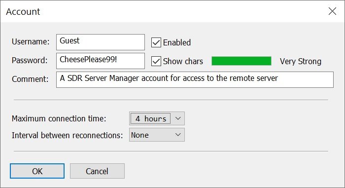 The account is not a Windows account , it's a new SDR Server Manager account you create, the name and password is chosen by you and is only used by this program. A suggested username is Guest, password is whatever you want.