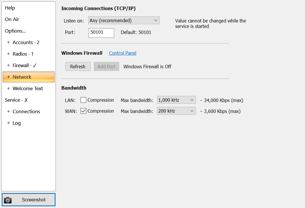 Select the address to listen on - usually any address is OK, but you can restrict the address to a specific network adapter, for example a wired connection. The default port is 50101. If the Windows firewall is enabled you must ensure the port is added to the list of open ports in the Inbound rules, the protocol used is TCP.